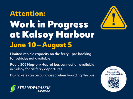 From June 10th to August 5th the sailing on route 56 between Klaksvík and Kalsoy will be affected by work in the harbor at Syðradal.