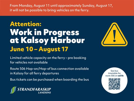During this period, it will not be possible to transport vehicles with our ferry between Klaksvík and Kalsoy. All vehicle bookings during this time, including additional passengers on the same booking, will be cancelled and refunded within a few days.