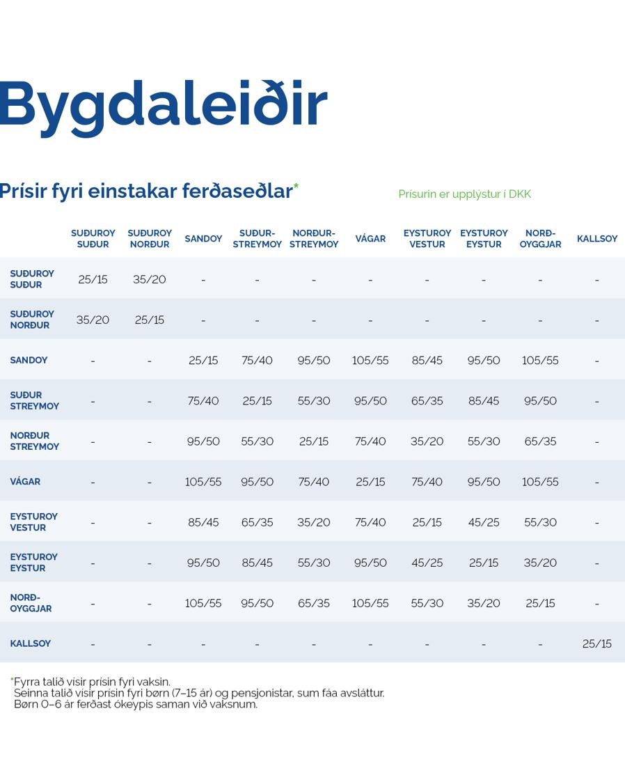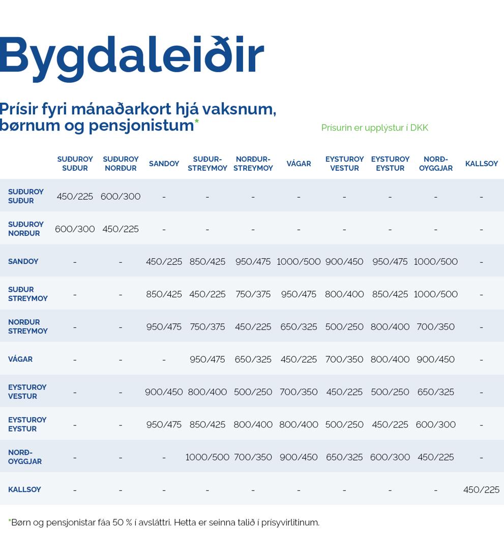 Niðanfyri síggjast prísir yvir ferðaseðlar við bygdaleiðum, og yvir prísir fyri mánaðarkort á ymisku leiðunum.