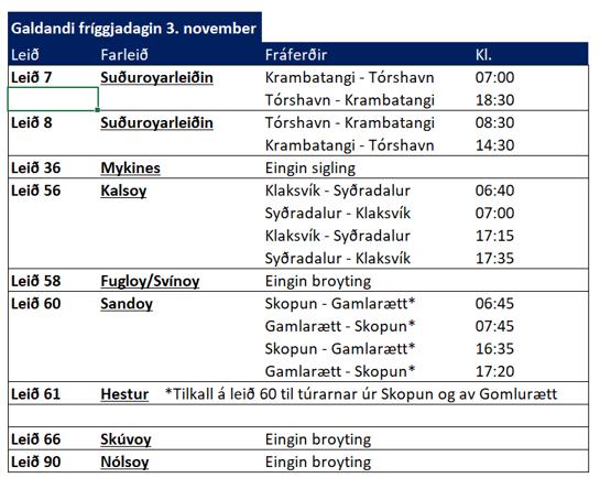 Vanlig ferðaætlan kemur í gildið aftur leygarmorgunin 4. november.