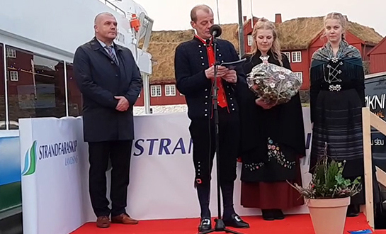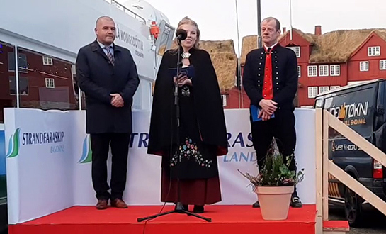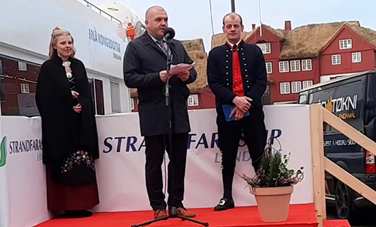 Hilmar Eliasen, stjóri á Strandferðsluni, bar fyrst fram røðu og greiddi frá tilgondini at byggja skipið, til at tað nú liggur klárt at fara í sigling.
