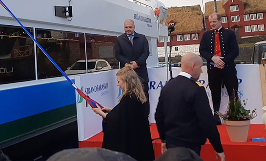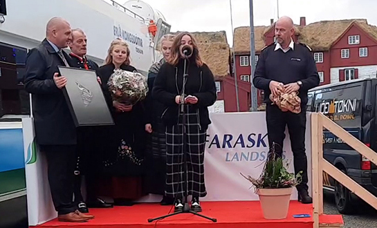 Síðani bar Ásvør Vest Niclasen fram yrking hjá landsstýrismanninum, áðrenn hon doypti skipið. Eisini handaði 17 ára gamla Ýr Ákadóttir, Strandferðsluni ein máling, ið nú hongur uppi í salónini á skipinum.