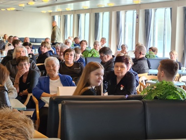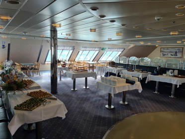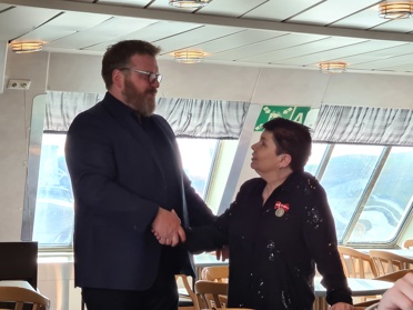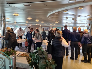 Tað var ein sera hugnalig løtu umborð á Smyrli við væl dekkaðum borði og vøkrum blómutyssum, ið Maiken Dimon, starvsfelagi hjá Margit, hevði heintað úr sínum egna hava. Tað merktist, at Margit er væl lýdd millum sínar starvsfelagar, ið høvdu lagt nógv fyri at gera løtuna so hátíðarliga og serstaka. Tað mesta av matinum var gjørdur umborð á Smyrli av dugnaliga køkstoyminum.