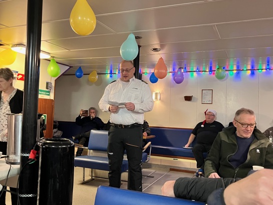 Á samkomuni í dag bjóðaði Óli við Ravnagil, ið saman við Mariusi Sørensen eru skiparar umborð á Sam, vælkomin og greiddi frá, hvussu stóran týdning skipið hevur havt fyri sambandi út í Kalsoynna og fyri føroyska samferðslu sum heild.