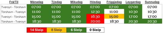 Á flestu túrunum er pláss sett av til 6 sleip. Undantøk frá hesum sæst í talvuni omanfyri. Er pláss og tíð er til tess, verða fleiri sleip tikin við enn ásett.